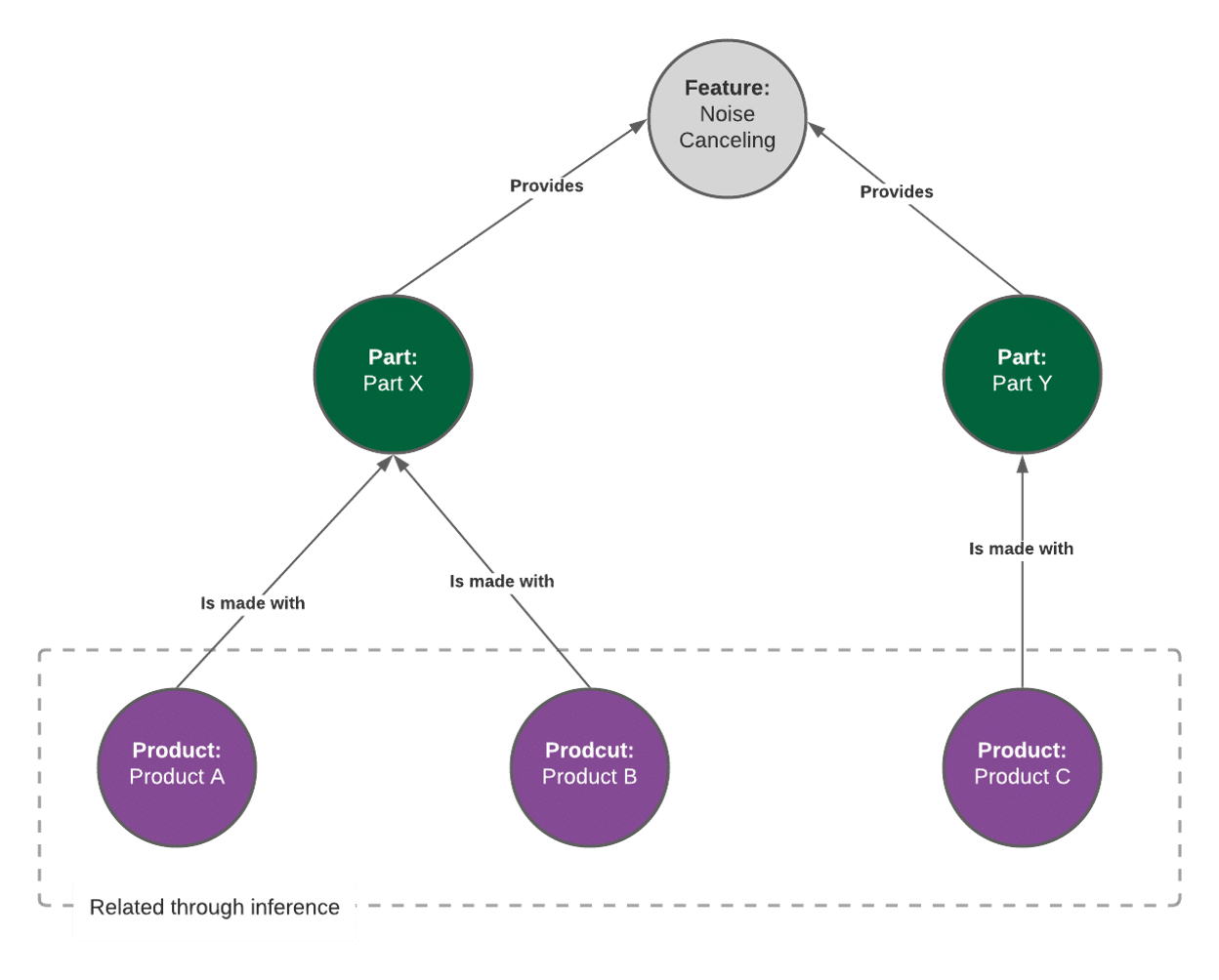 Additional personalization can be offered through a feature in graphs called inference. Inference occurs when two entities in the graph are seen as related because they have relationships in common. For example, two products that a company offers might use a part that lowers noise. A third product might use a different part, but one that also offers noise canceling features. Even though these products are not directly related we can infer that they are similar because the parts that they use have a similar characteristic (see the image below).