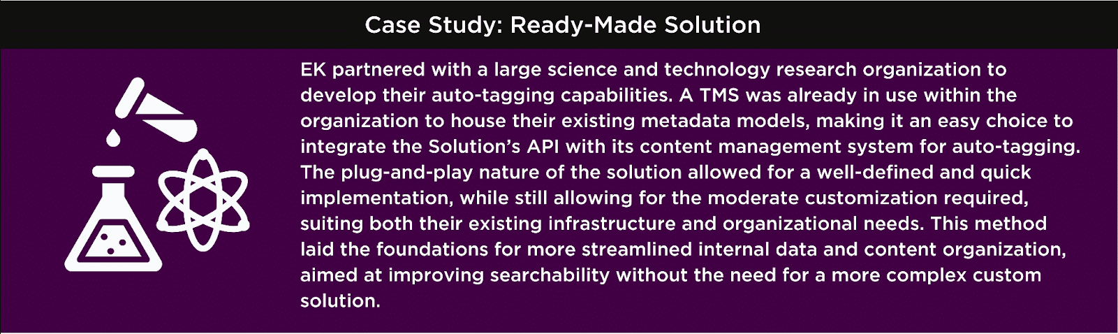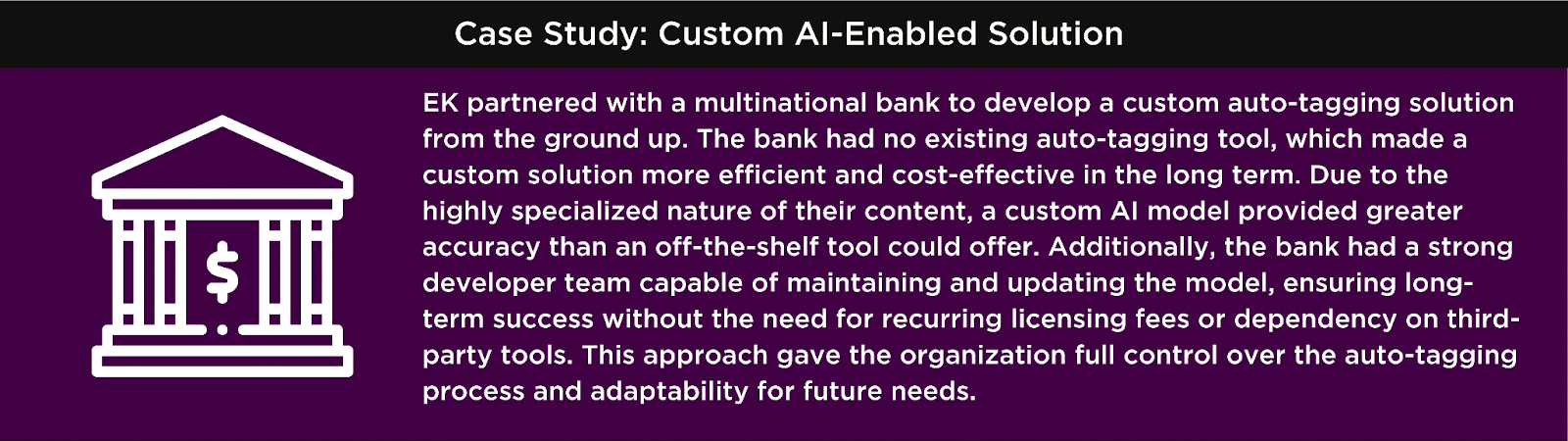 While each approach has its benefits, no solution is entirely hands-off—all solutions on the Spectrum of Customizability require human input to ensure accuracy,  relevance, and usability. The right choice depends on your organization’s specific needs, data complexity, and level of control over the tagging process. The next few sections will dive into the specifics of Ready-Made vs  Custom AI-Enabled Solutions and expand on the Spectrum of Customizability.